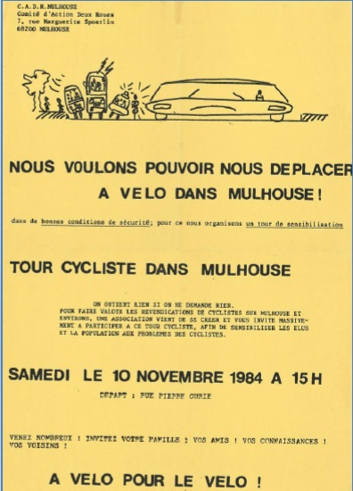 Dès novembre 1984, une première manifestation pour le vélo est organisée à Mulhouse. D’autres manifestations sont organisées les années suivantes. L’édition 1986 est un réel succès : plus de 300 cyclistes répondent au rendez-vous.